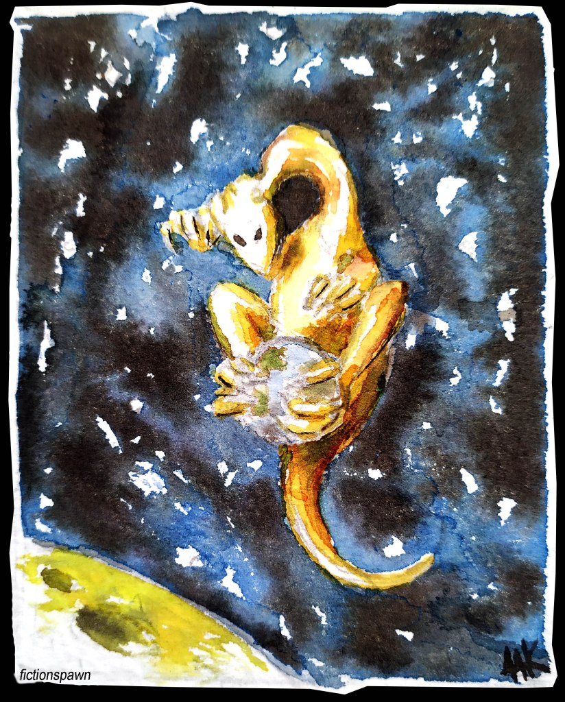 The creature landed on the little ball which was the home they had left. Big foot claws sunk into land and sea. It lifted is hand.