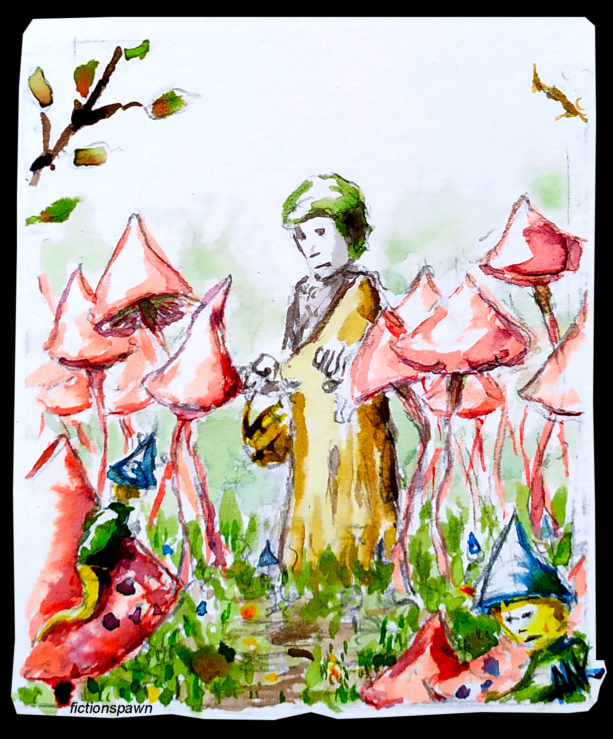 He ran through the little mushroom forest as fast as he could with his little tail body. The others ran back and forth in panic, screaming, crying.