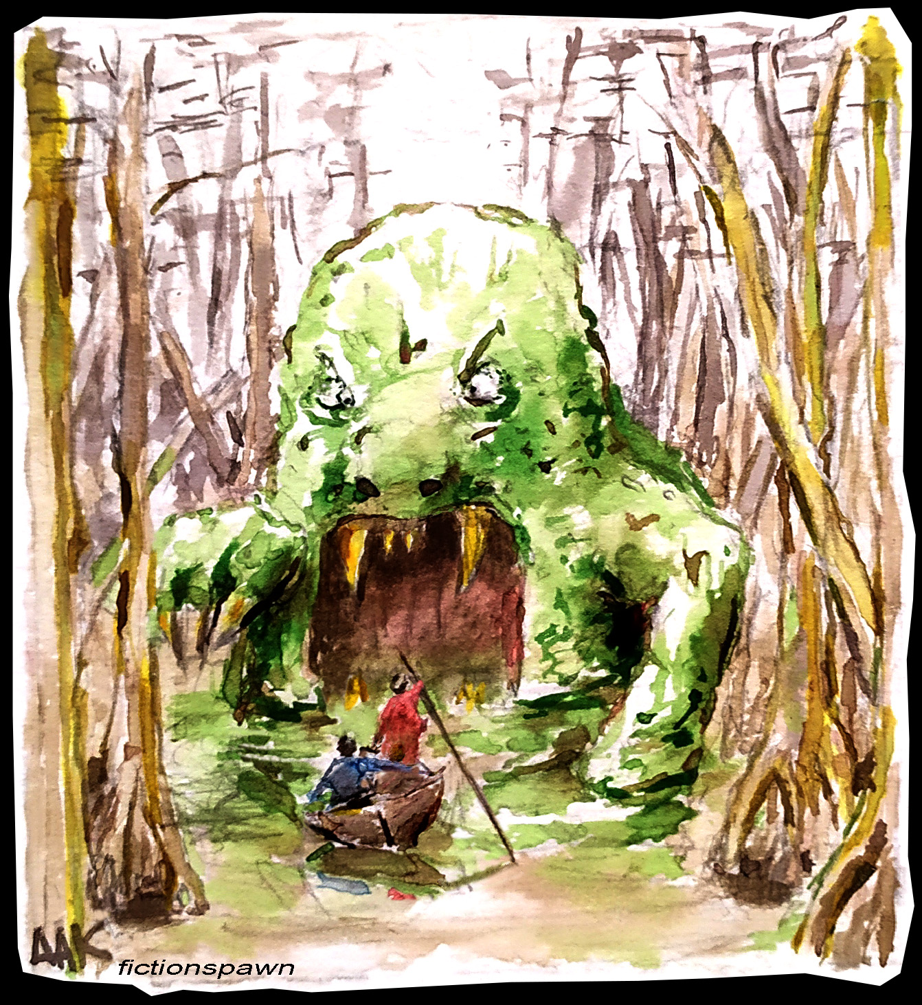 He lay still, hardly breathing. The swamp monster ran back and forth, muddling up the dirty water even more. It stopped, breathing heavily. It’s roar made the trees shiver before it turned back and  disappeared into the hole it had emerged from.