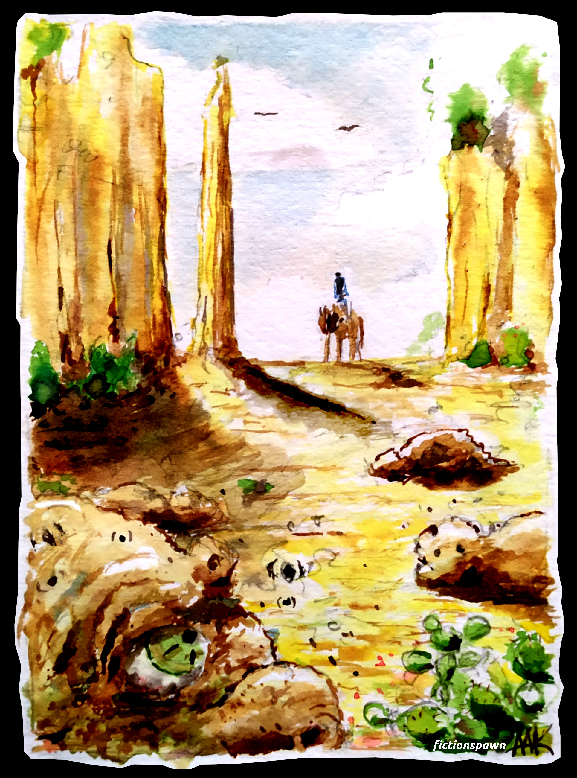 He rode down rocky slopes and overgrown tracks. Through rivers so dirty he had never seen the like. The smell stayed on his horse’s legs, tearing his nose. Loathing. He felt dizzy, his stomach revolted. He heard the dirt piles around him moan in agony and self disgust. Their suffering dug into his back with the evening sun.