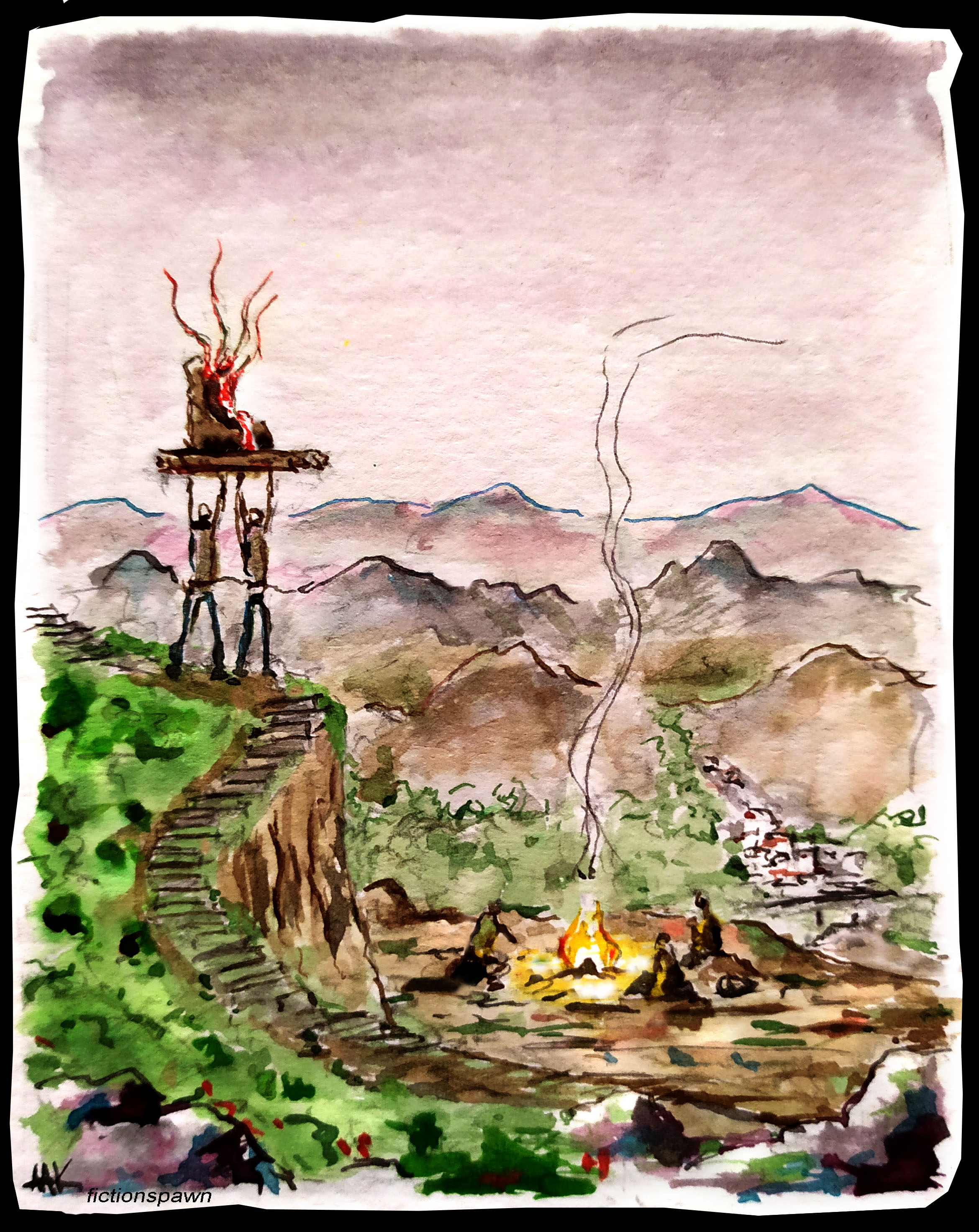 The next day they kept walking. They held their god on straight arms even though the burden was heavy and their limbs hurt. The pain was their cleansing, their road to salvation. Their suffering fed their king.