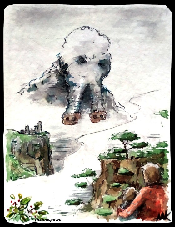 She waded over to the shore where her clothes was. She didn’t feel safe any more, she felt threatened, watched. She heard something in the bushes. Froze.